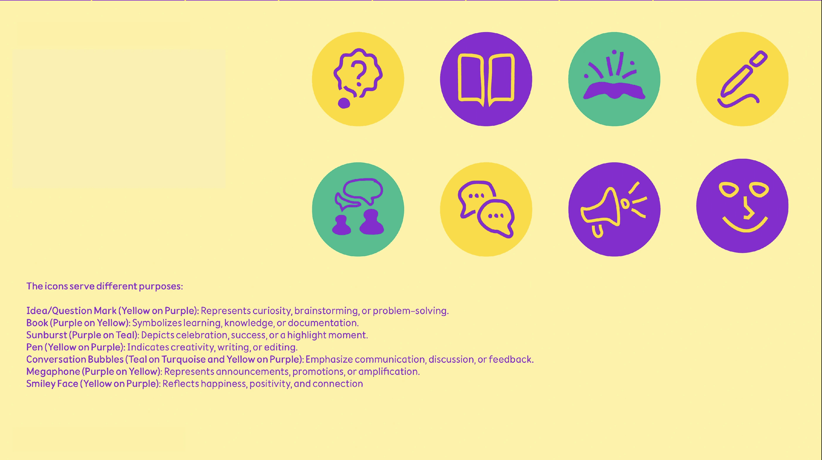 A custom icon set adds personality and meaning to the system. Each icon reflects one of the brand’s pillars: communication, creativity, curiosity, and connection.