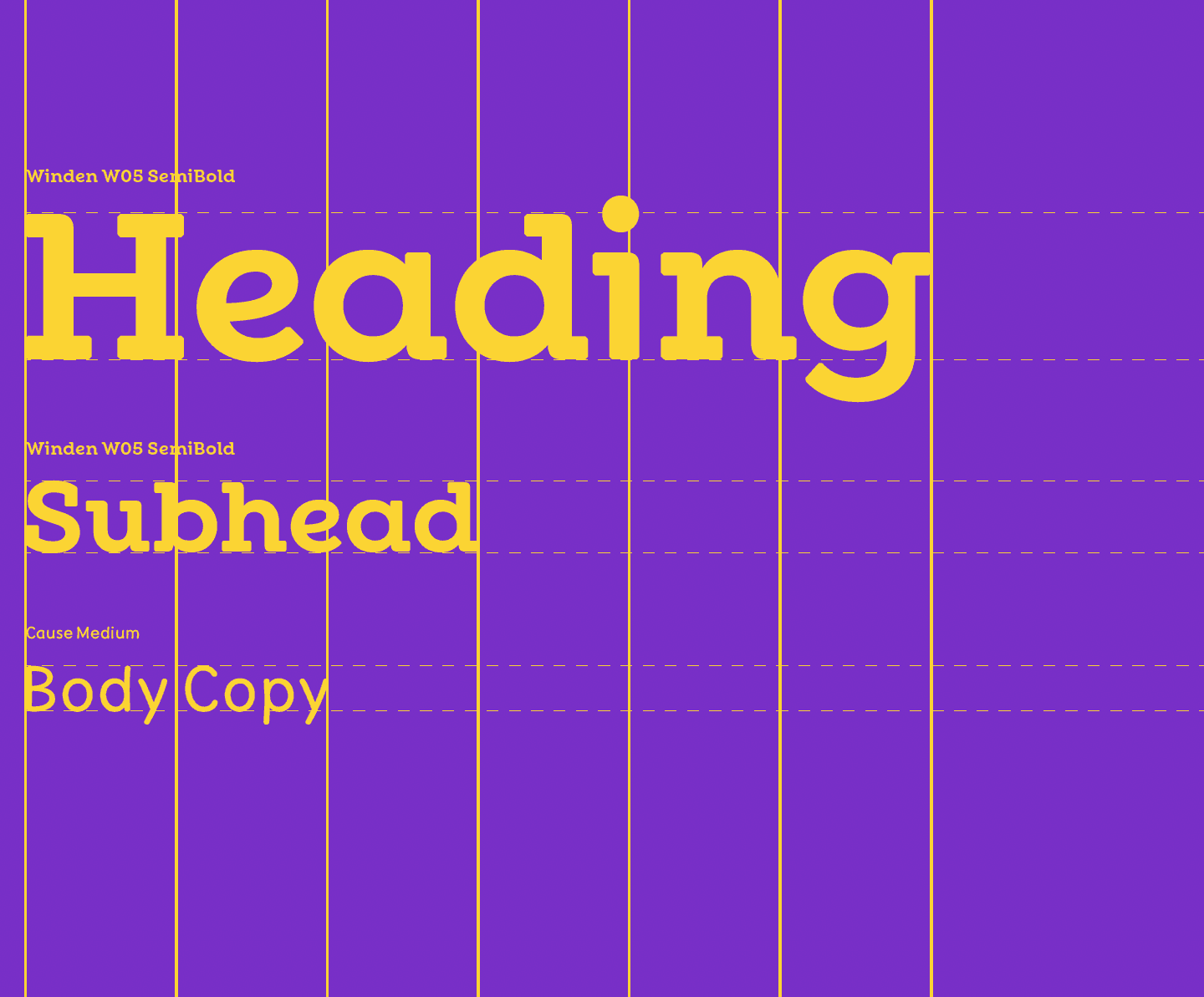 Winden delivers strength and presence for headlines, while Cause adds friendliness and flow to body text. The combination keeps the identity professional but conversational.