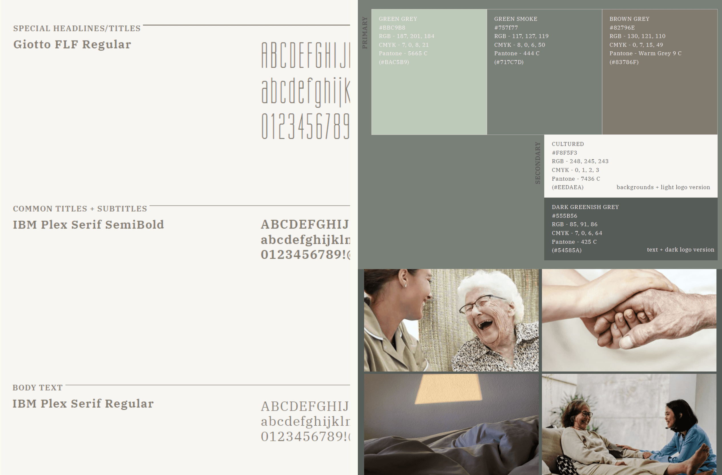 An earthy, calming palette built around sage green, soft neutrals, and green-grey tones provides a sense of reassurance and dignity. High-contrast dark tones support legibility, while secondary shades bring warmth and flexibility across applications.