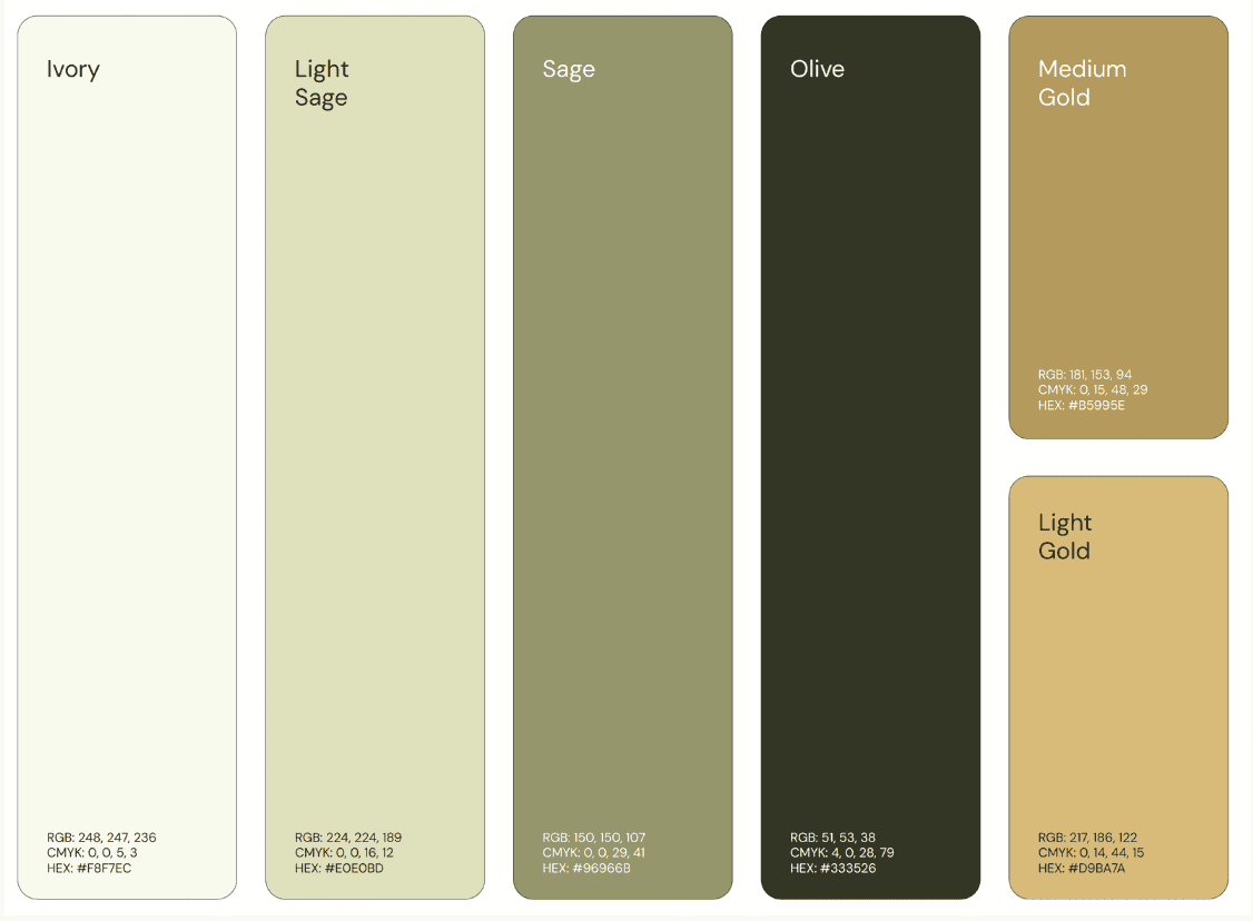 Rooted in nature, longevity, and luxury, carefully selected to evoke a sense of trust, wellness, and premium care. Olive & Sage Greens: Represent renewal, growth, and the holistic connection between skincare and overall well-being. Ivory: A soft, neutral base that enhances clarity and cleanliness, reinforcing the clinical yet inviting nature of the brand. Dark, Medium & Light Gold: Symbolise luxury, warmth, and high-end service, adding a refined, premium touch while maintaining approachability. This palette ensures a harmonious balance between science and self-care, embodying The Skin Wellness Hub’s core values.